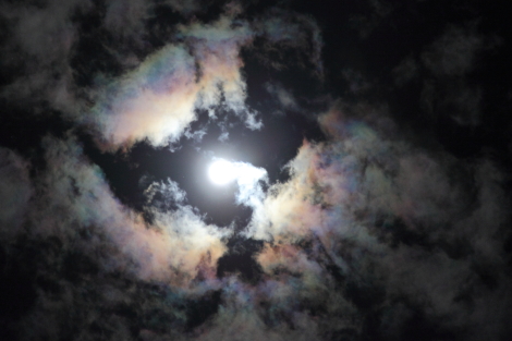 真っ暗な空と、白い雲の隙間から覗く月は、周りの雲に虹色の